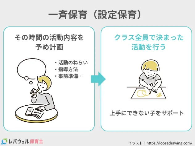 一斉保育では、保育士が内容を計画してクラス全員で同じ活動を行う