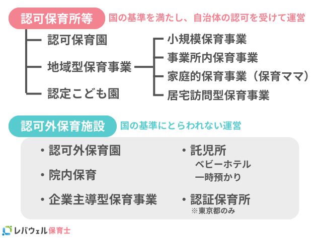 保育園は大きく分けると、認可保育所等と認可外保育施設の2種類です。ここでは、認可保育所等と認可外保育事業の特徴を解説します。