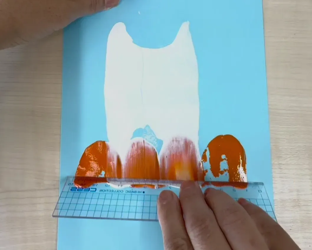 4歳児向けの10月のハロウィン製作では、定規やダンボールを画用紙に押し当てて引くことで、手先の巧緻性を育むのがねらいです。また、絵の具が混ざり合って新しい色が生まれたり、形が変わったりする面白さを味わいながら、ハロウィンへの関心を深めます。