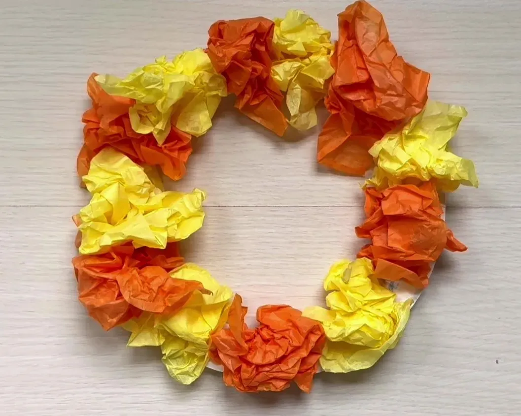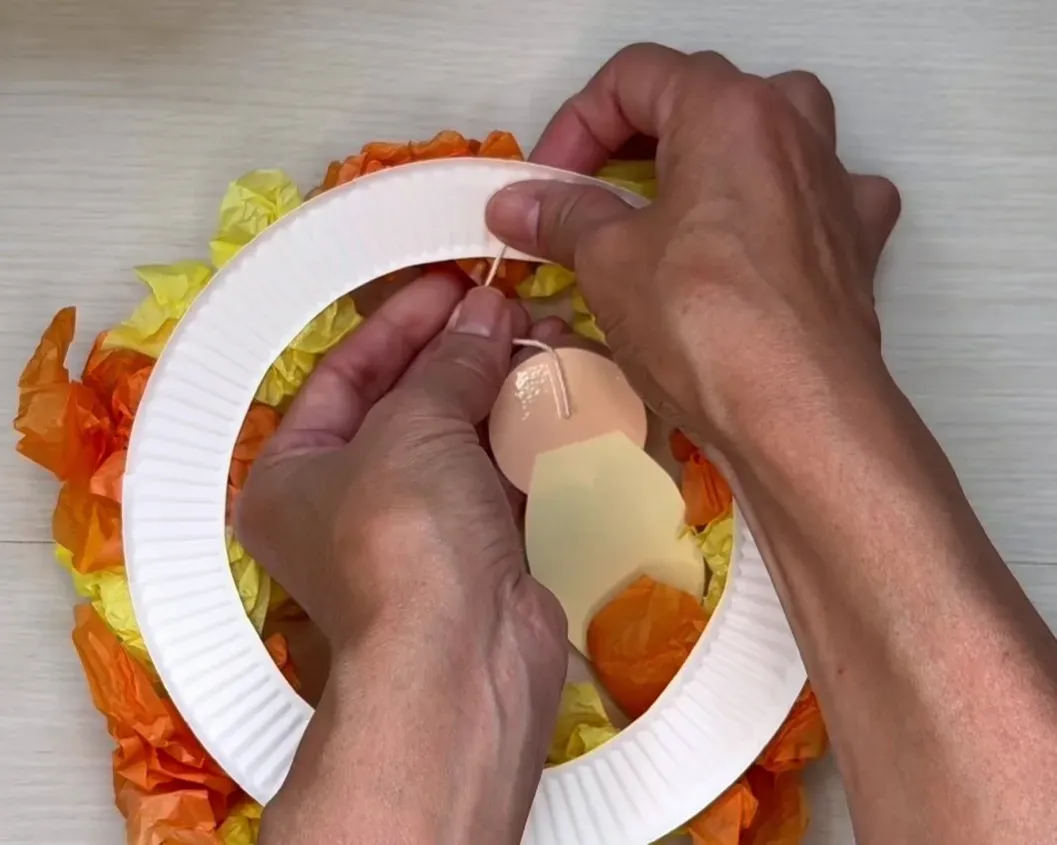 ➂くり抜いた紙皿にのりを塗り、丸めたお花紙を貼り付ける