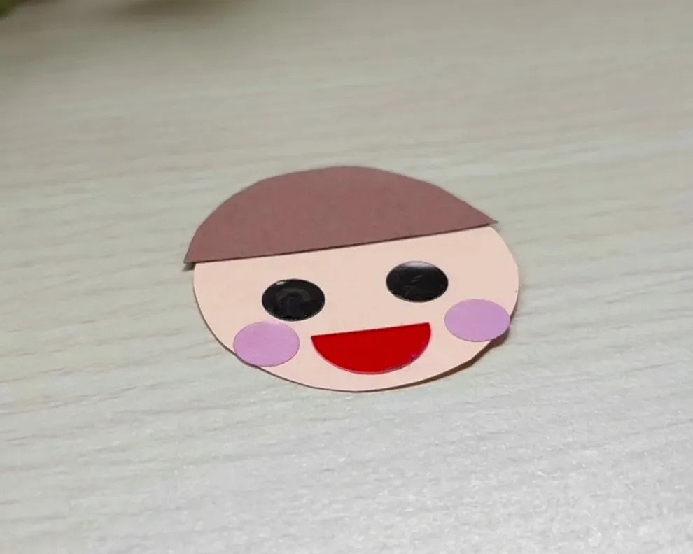 ⑥帽子・目・口・ほっぺをのりで貼り、ミノムシの顔を作る