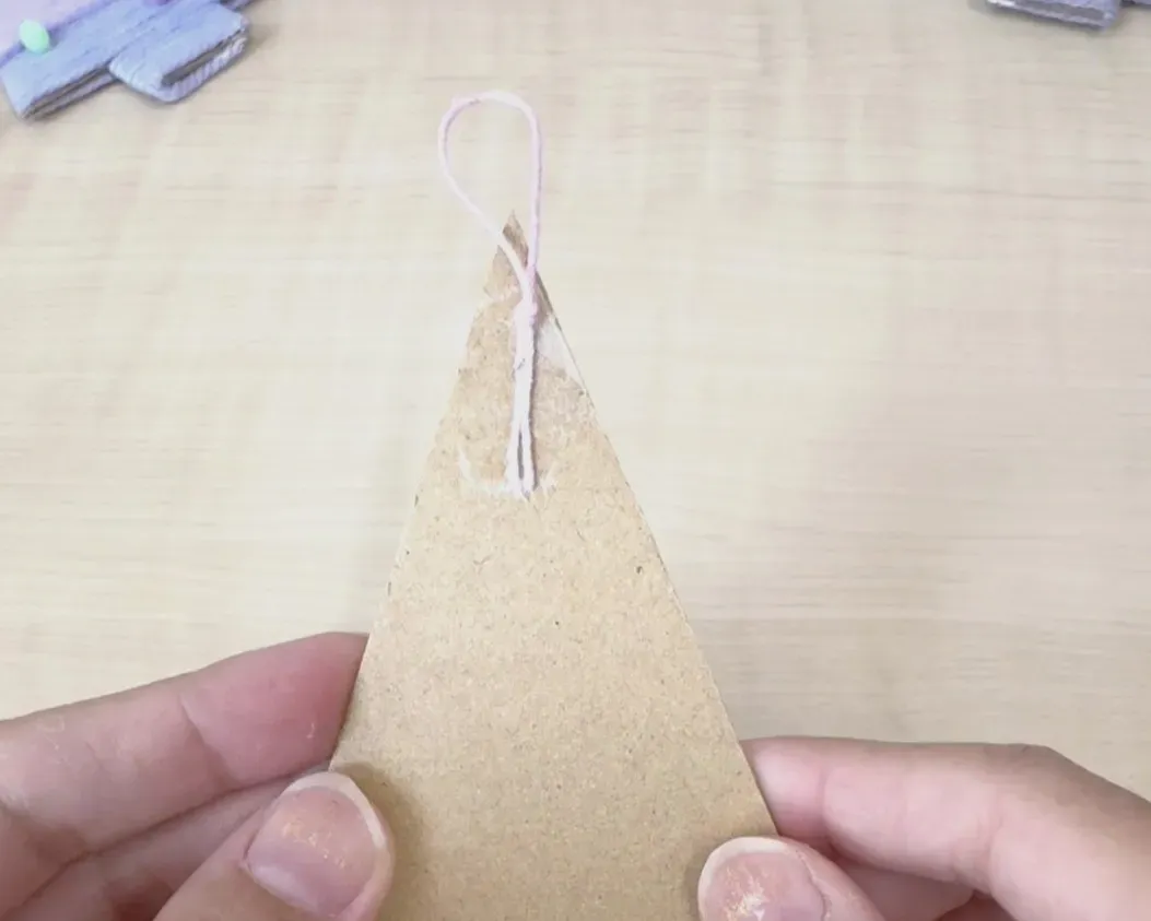 ④ツリーの頂上に毛糸の端を貼り付け、巻き付ける