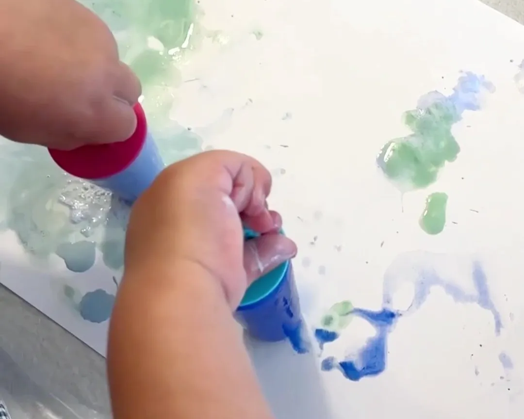 ④凍った絵の具を使って、画用紙に自由にお絵描きをする