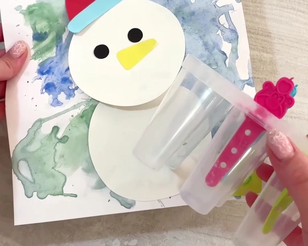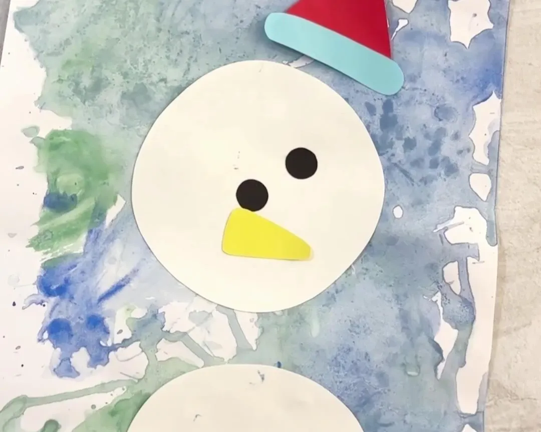 ➄絵が乾いたら、雪だるまの顔や体のパーツを貼り付ける